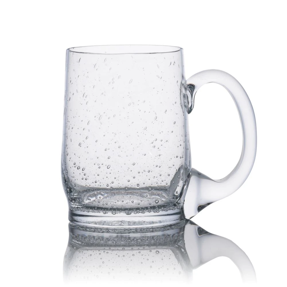 Originální skleněný půllitr, foukaný do dřevěné formy z hutního skla, za tepla zapalovaným hrdlem, sypaný sodou, která ve skle dělá drobné a nepravidelné bublinky.